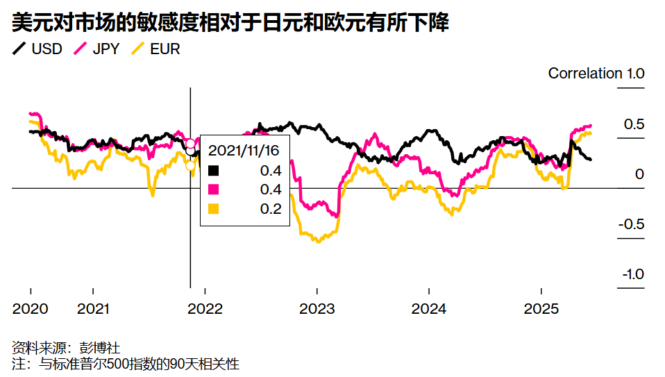 值得关注的是,美元汇率波动与风险情绪指标的相关性出现结构性变化。监测显示,美元对上述六种新兴市场货币与标普500指数的90日滚动相关性指标大幅走低,而欧元、日元与该指数的关联度却攀升至五年高位。这种分化恰逢标普500指数突破4月关税风波阴影再创历史新高,叠加日本央行退出负利率政策及8月日元套利交易大规模平仓的影响,使得欧元和日元更容易受市场情绪波动牵制。
